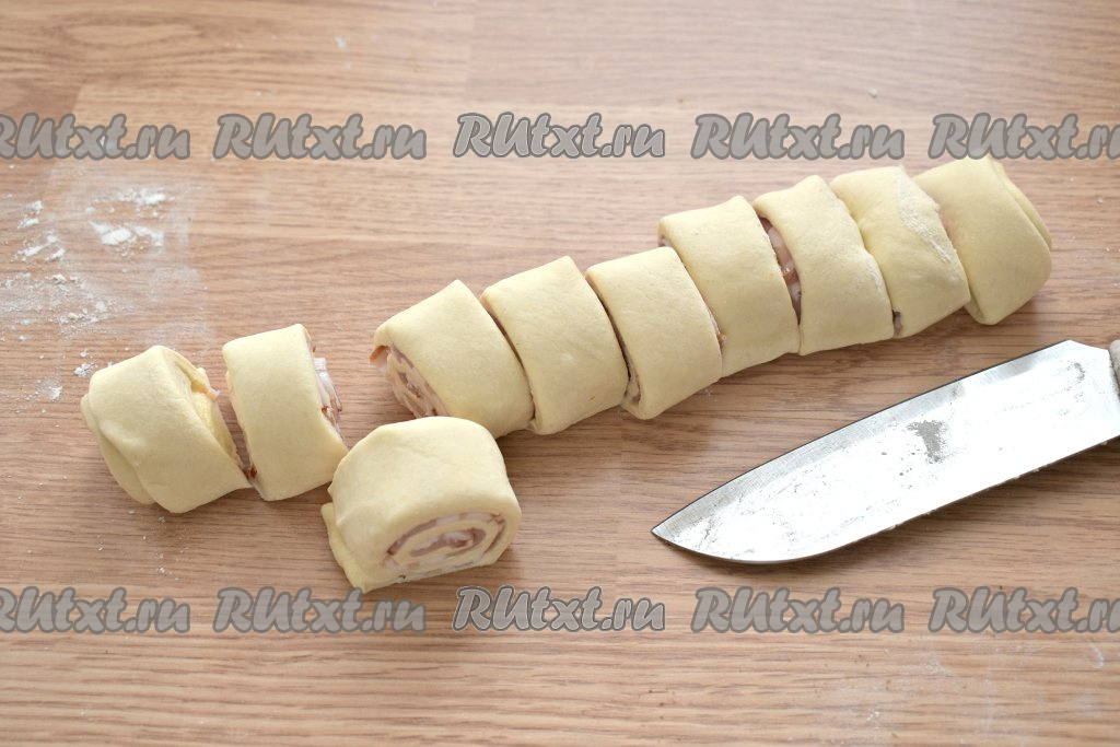 Получившийся рулет нарезаем острым ножом на одинаковые кусочки шириной примерно 2-3 сантиметра. У меня получилось 10 заготовок слоек с беконом.