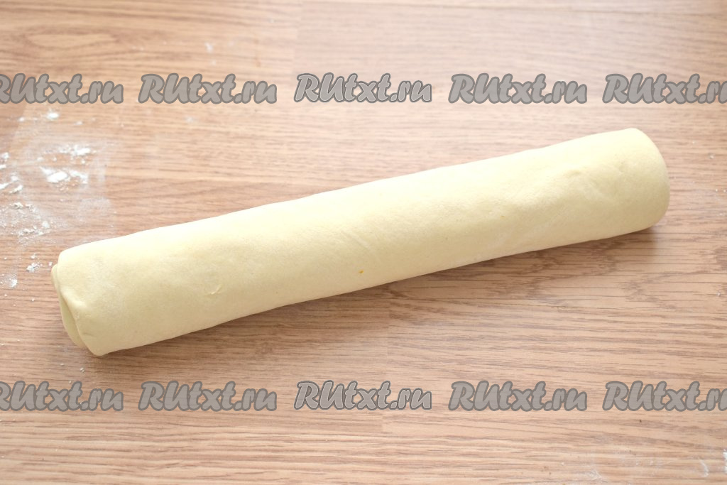 Поверхность стола присыпаем мукой, выкладываем пласт теста и немного раскатываем.