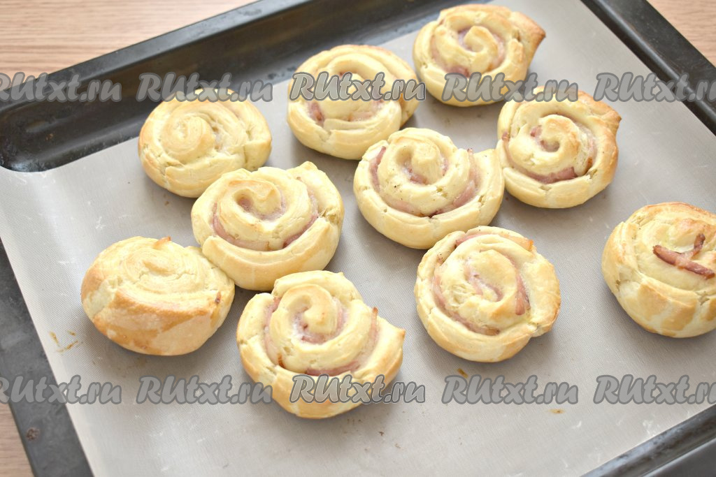 Отправляем противень с заготовками слоек с беконом в предварительно разогретую до 180 градусов духовку на 25-30 минут (ориентируйтесь на свойства своей духовки). Слойки должны увеличиться в размере и подрумяниться.