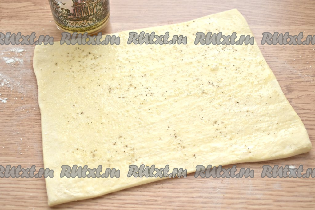 Яйцо взбиваем вилкой (или венчиком), а затем смазываем им всю поверхность раскатанного пласта теста (часть взбитого яйца оставляем для смазывания слоек перед выпечкой). Немного солим смазанное тесто и перчим.