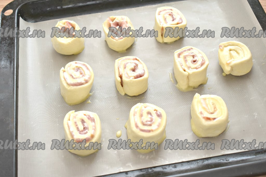 Заготовки слоек перекладываем разрезом вверх на противень, застеленный листом для выпечки (или пергаментом). Выкладывать рулетики нужно на расстоянии друг от друга, так как они увеличатся в размере во время выпечки. Бока и верхушку рулетиков смазываем взбитым яйцом.