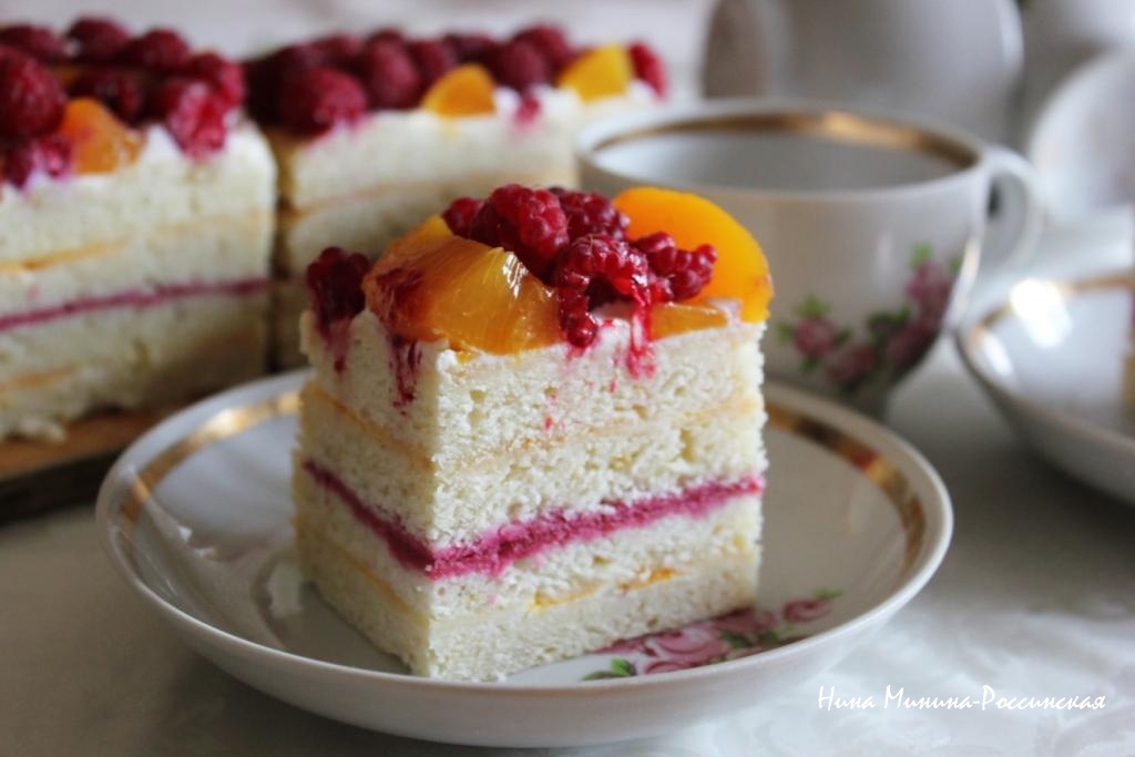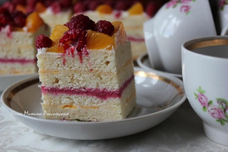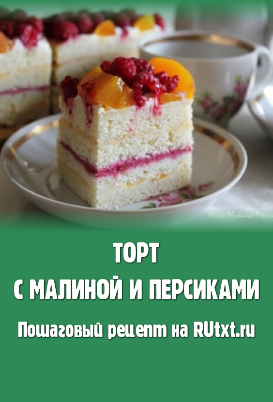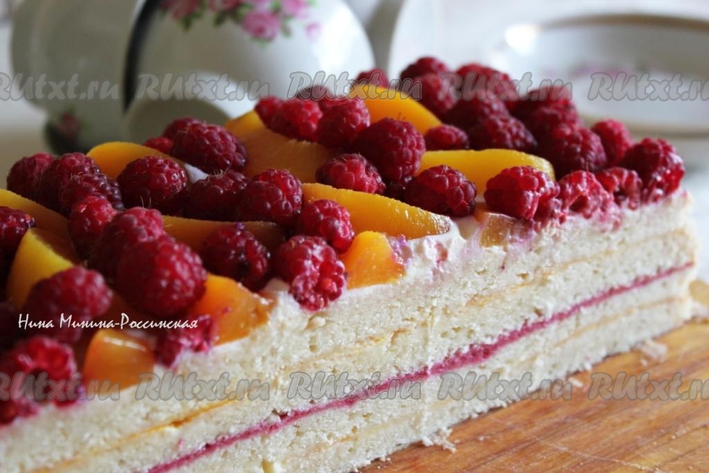 Тесто для коржей этого торта с малиной и персиками использовалось незатейливое сметанное, которое и приготовить просто, и испечь быстро. Нежный крем на основе маскарпоне и гармоничное сочетание малины с персиками делают этот торт очень приятным на вкус.