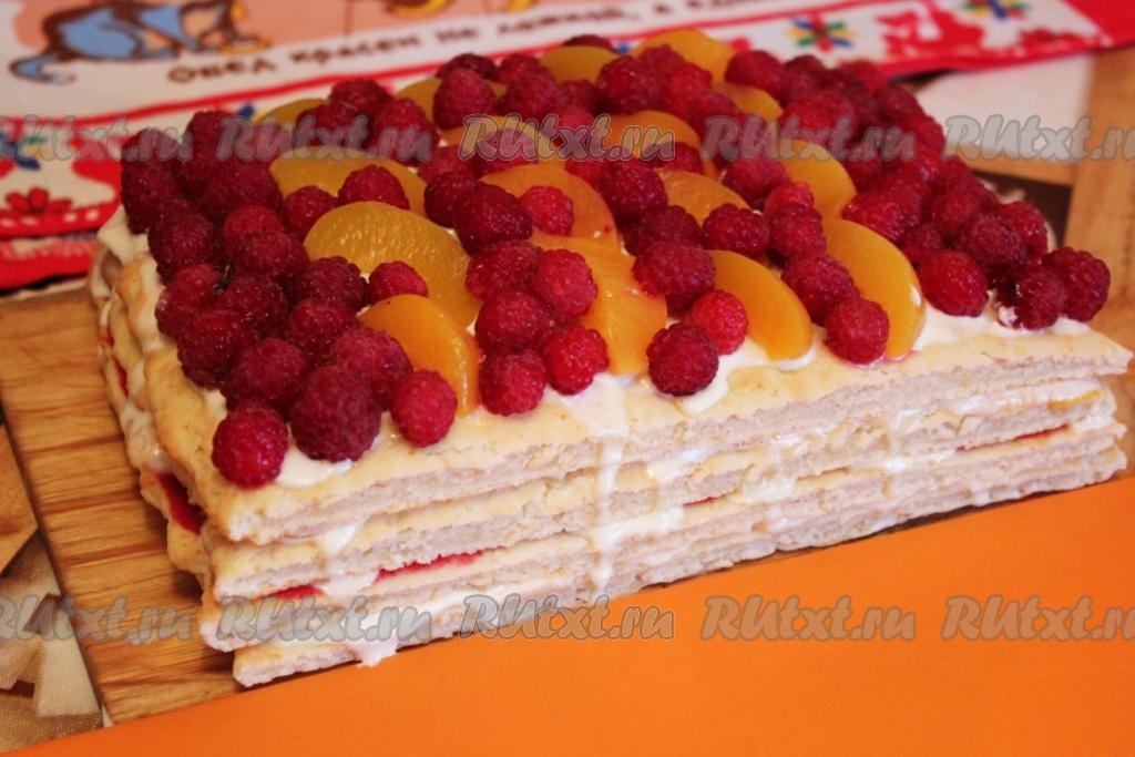 четвертый корж, крем из маскарпоне.Украсьте торт малиной и кусочками персика.