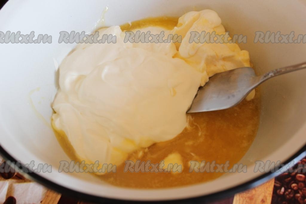 Добавьте сахар и муку с содой. Соду не гасить, она среагирует с кислотой сметаны.