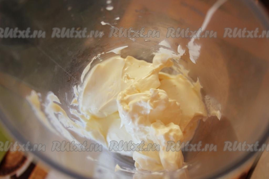 Для приготовления крема взбейте маскарпоне со сладким сиропом от консервированных персиков, количество сиропа по вкусу, примерно 50 мл.