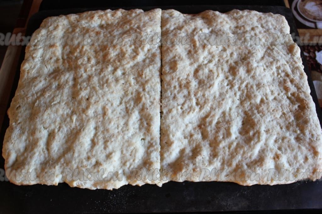 Испеките коржи на смазанном противне, силиконовом коврике или бумаге для выпечки в разогретой духовке при 200 градусах около 15 минут, коржи должны остаться мягкими.