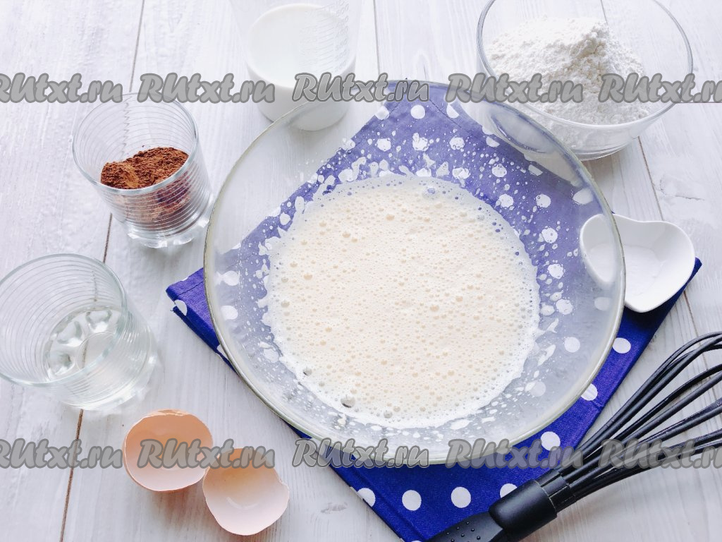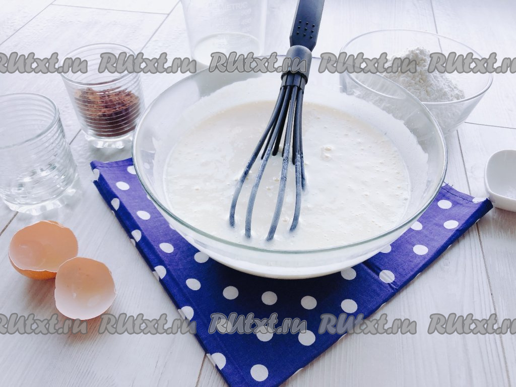 Затем в кефирную смесь просеиваем муку. Любители шоколада могут добавить какао. Перемешиваем до тех пор, пока в тесте не останется комочков. Должно получиться густое, тягучее тесто, как на оладьи.