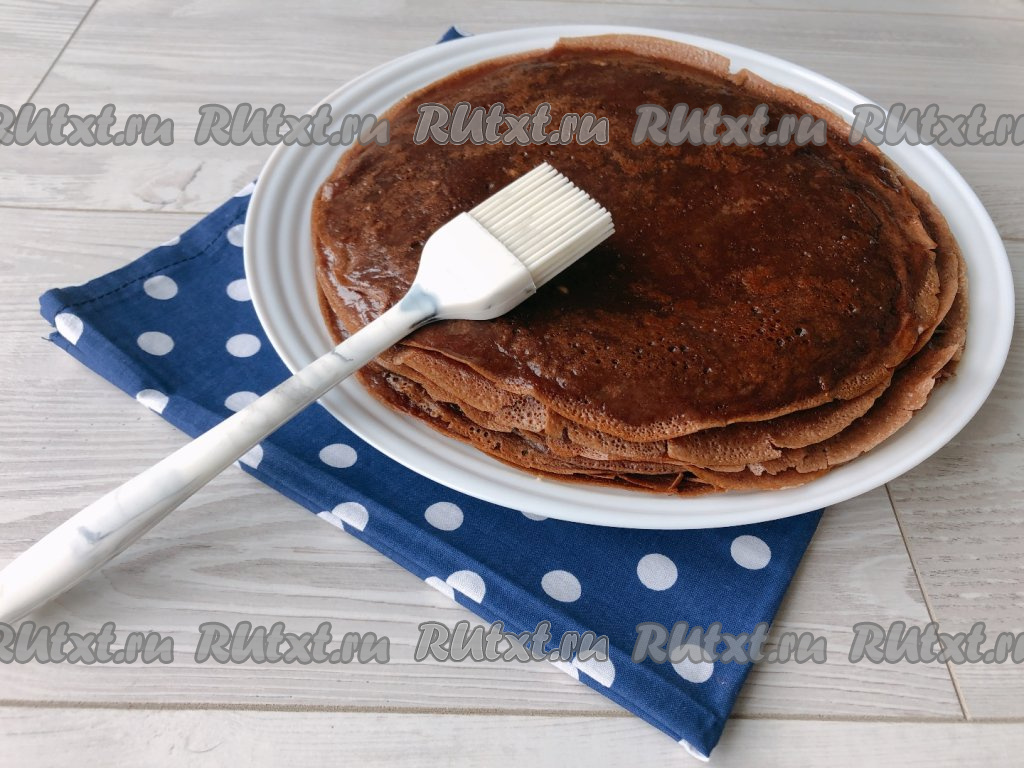 Поверхность блина смазываем растопленным сливочным маслом, это придаст блинчику приятный аромат и невероятную мягкость. Постепенно выпекаем все блинчики (я выпекала на сковороде диаметром 21 сантиметр, из указанного количества ингредиентов получилось 13 блинов). Блинное тесто в миске периодически перемешиваем. В составе блинного теста есть растительное масло, поэтому после жарки первого блинчика сковородку можно больше маслом не смазывать, но многое зависит и от качества покрытия сковороды.