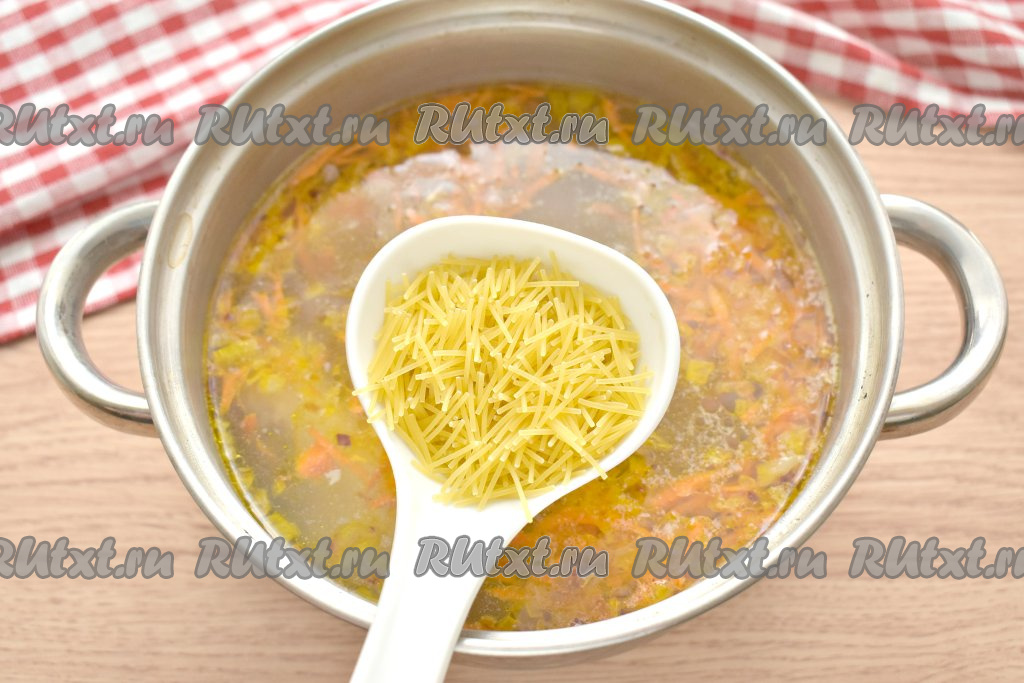 Затем всыпаем в суп мелкую вермишель, сразу хорошо перемешиваем. Варим суп с вермишелью и куриными крылышками ещё 5 минут.