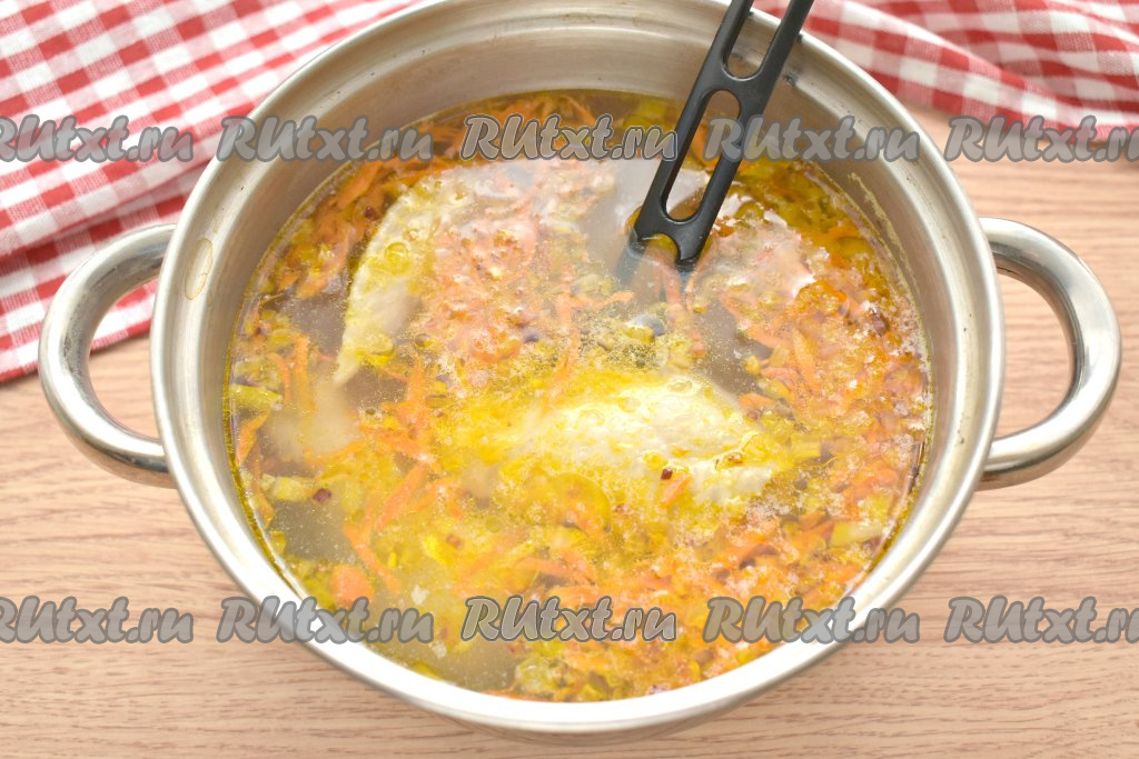 После того как картошка проварится 15 минут, добавляем в кастрюлю обжаренные овощи, даём куриному супу закипеть и варим его далее на небольшом огне 5 минут.