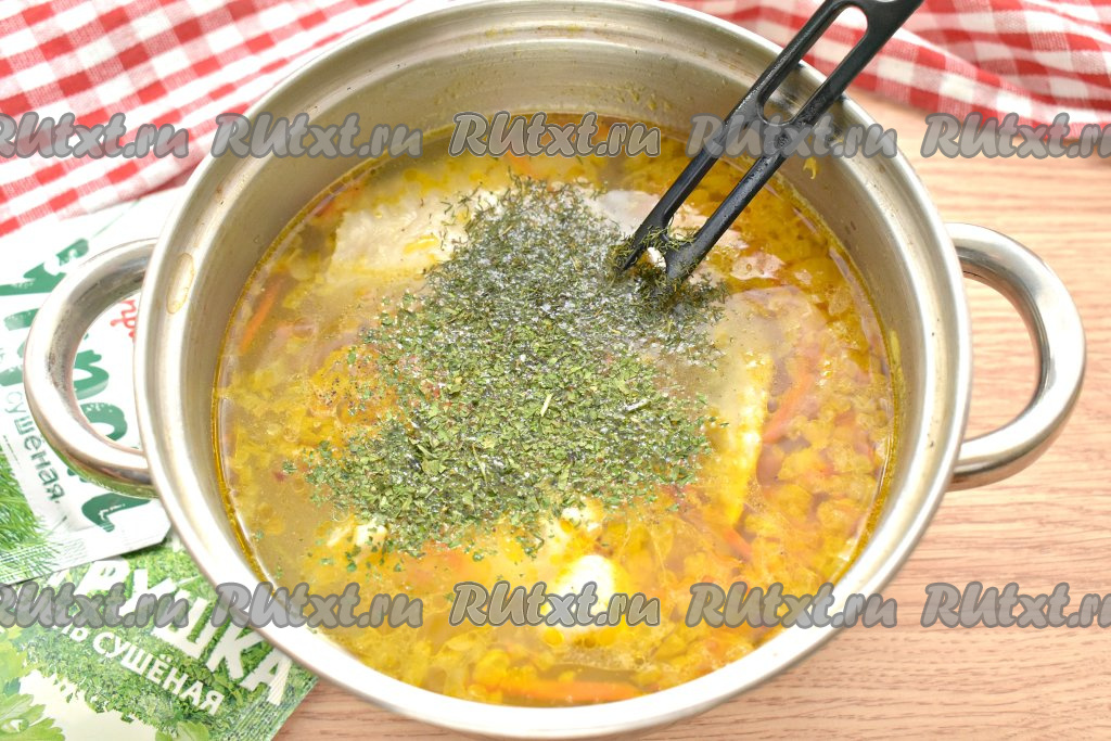 В конце приготовления суп солим, перчим (если суп готовите не только для взрослых, но и для детей, тогда перец не потребуется). Ещё я добавила сушёную зелень. Даём супу закипеть, провариваем 1-2 минуты и убираем с огня. Оставляем суп под крышкой на пару минут, а потом разливаем по тарелкам.