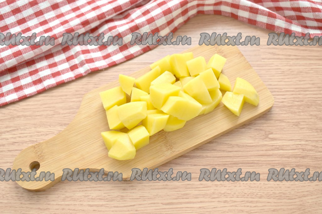 После того как крылышки проварятся 20 минут, добавляем в кастрюлю очищенную и нарезанную на небольшие брусочки картошку, даём закипеть, а после этого варим на небольшом огне минут 15.