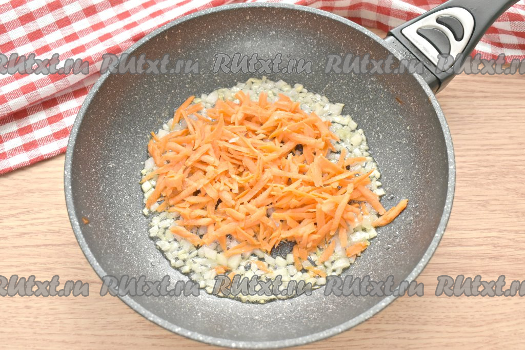 Когда лук станет прозрачным, добавляем к нему очищенную и натёртую на крупной тёрке морковку, обжариваем овощи, иногда помешивая, на среднем огне 3-4 минуты.