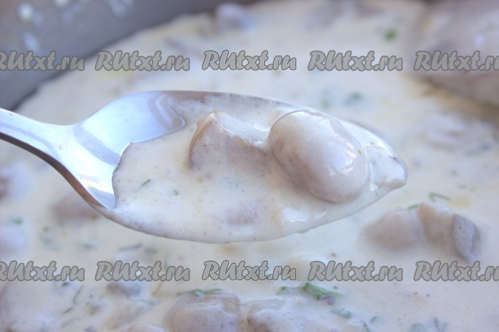 В сковороду с шампиньонами влить уваренные сливки, посолить по вкусу, посыпать чёрным молотым перцем, перемешать. Соус уже на этом этапе получается невероятно вкусным.