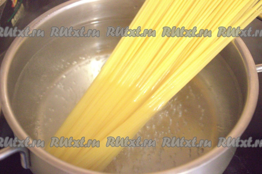 В кастрюлю подходящего размера влить воду (в соотношении 1 литр воды на 100 грамм макаронных изделий), поставить на сильный огонь. После того как вода закипит, подсолить её, выложить спагетти, полностью погружая их в воду, аккуратно перемешать, снова дать закипеть воде и уменьшить огонь.
