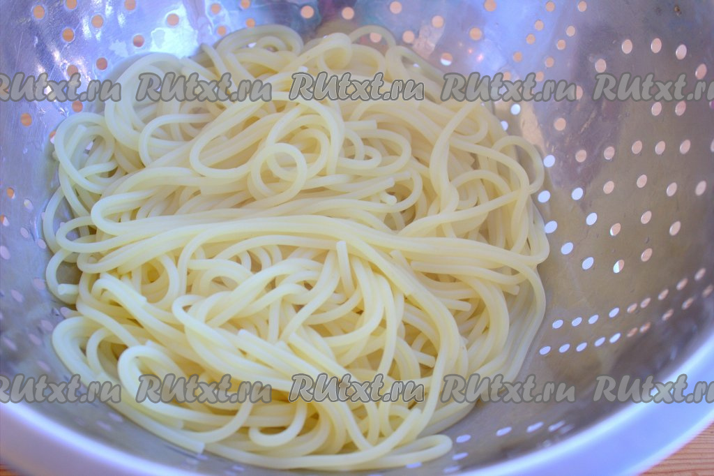 Варить спагетти до готовности (обычно на варку требуется минут 7-8, но точное время приготовления смотрите на упаковке ваших макаронных изделий), периодически перемешивая. Готовые спагетти откинуть на дуршлаг и, по желанию, промыть холодной водой (я не промывала).