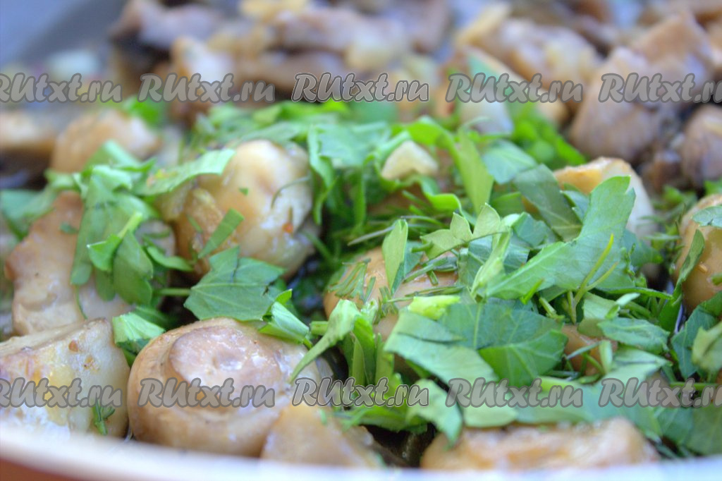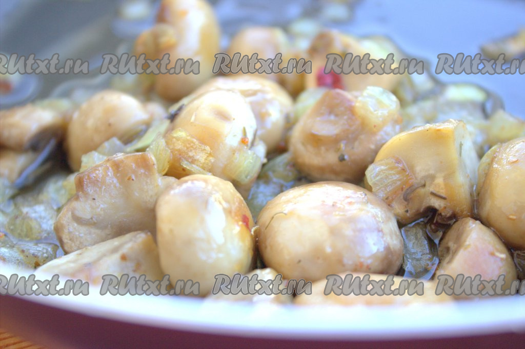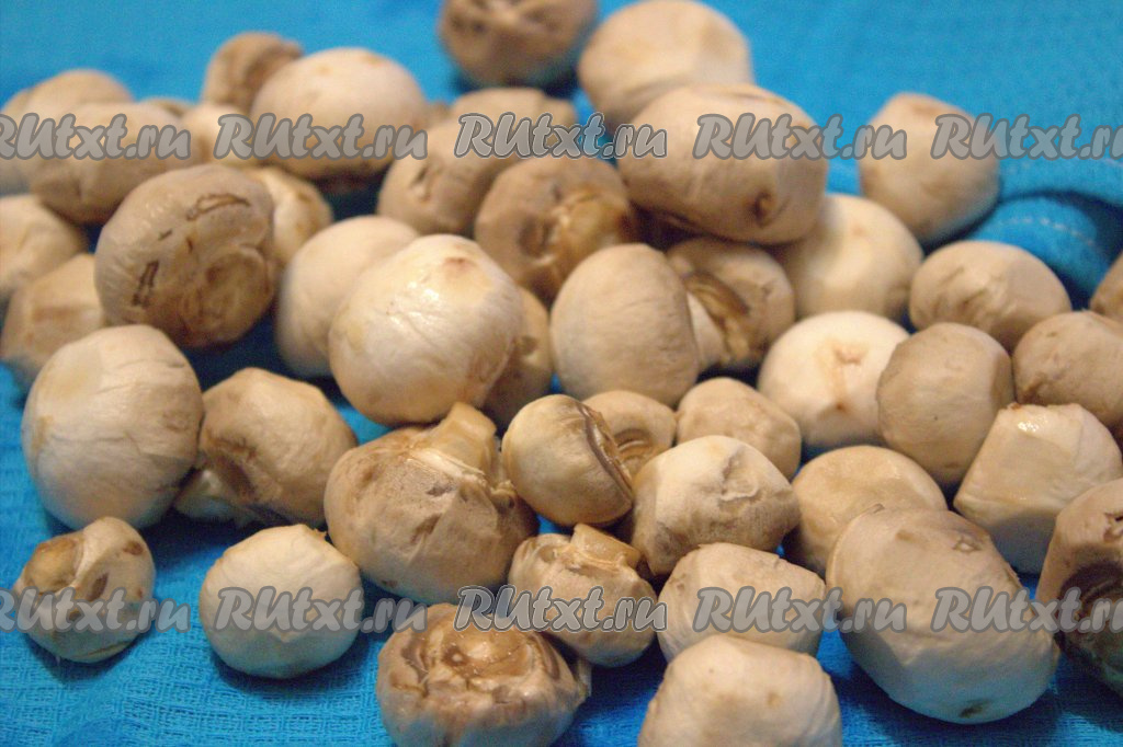 Шампиньоны промыть водой, удаляя с их поверхности загрязнения, затем немного обсушить. Мелкие грибочки можно оставить целыми, средние и крупные грибы нужно разрезать на 2-3 части.
