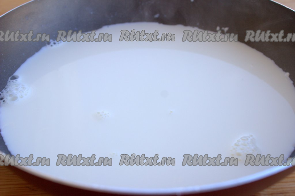 В глубокую сковороду влить сливки (масло в сковороду добавлять не нужно) и, не накрывая крышкой, уваривать сливки на сильном огне, помешивая, минуты 3-4 (за это время часть воды из сливок выпарится и они в дальнейшем придадут соусу более насыщенный вкус).