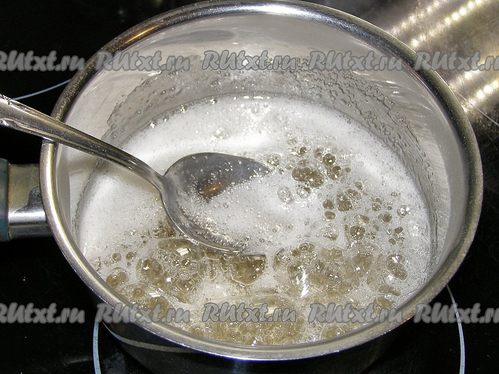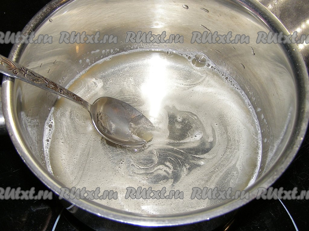 В сотейнике соединяем сахар и 100 миллилитров воды, перемешиваем и ставим на средний огонь.