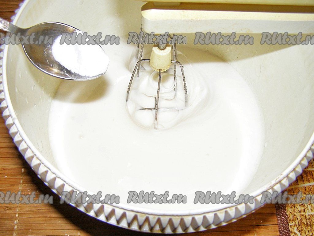 Затем, не переставая взбивать, в получившуюся массу добавляем половину чайной ложки соды и ванилин.