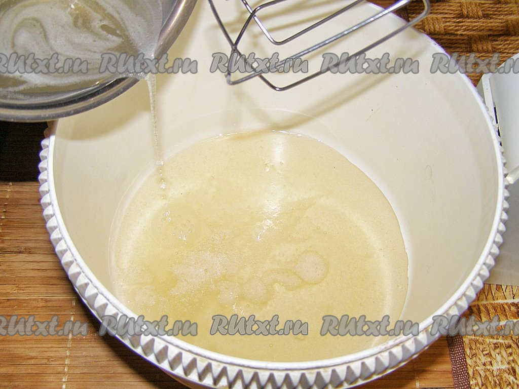Переливаем желатиновую массу в чашу миксера с сиропом, взбиваем миксером сначала на небольшой скорости, потом скорость увеличиваем и взбиваем минут 10. Масса должна побелеть и увеличиться в объёме.