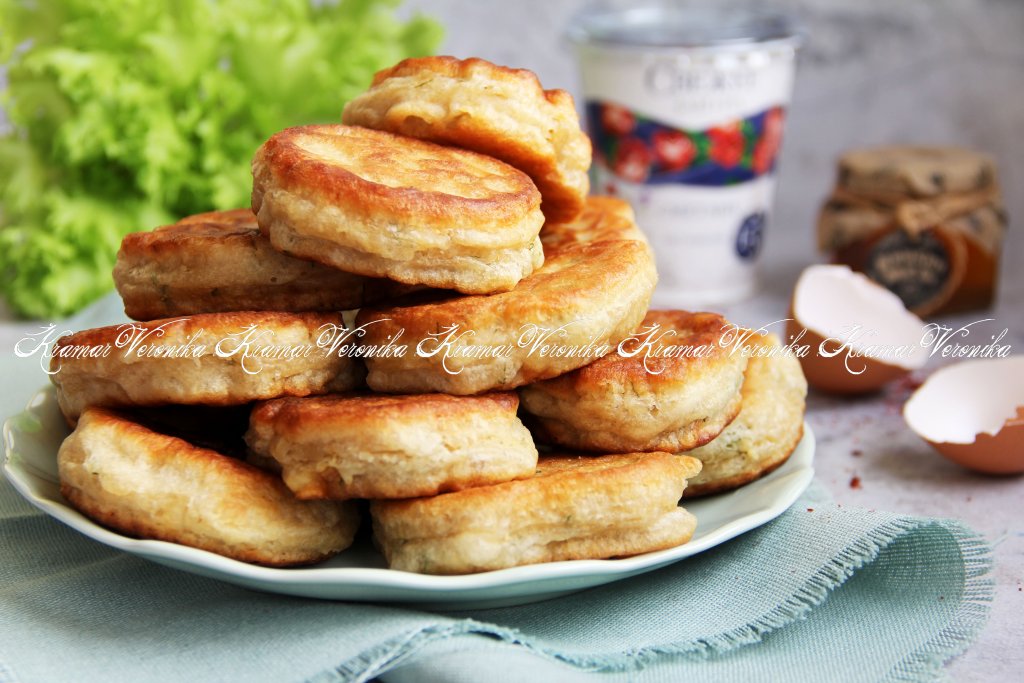 Перемешать тесто для оладий, оно получится воздушным, не очень густым и вязким.