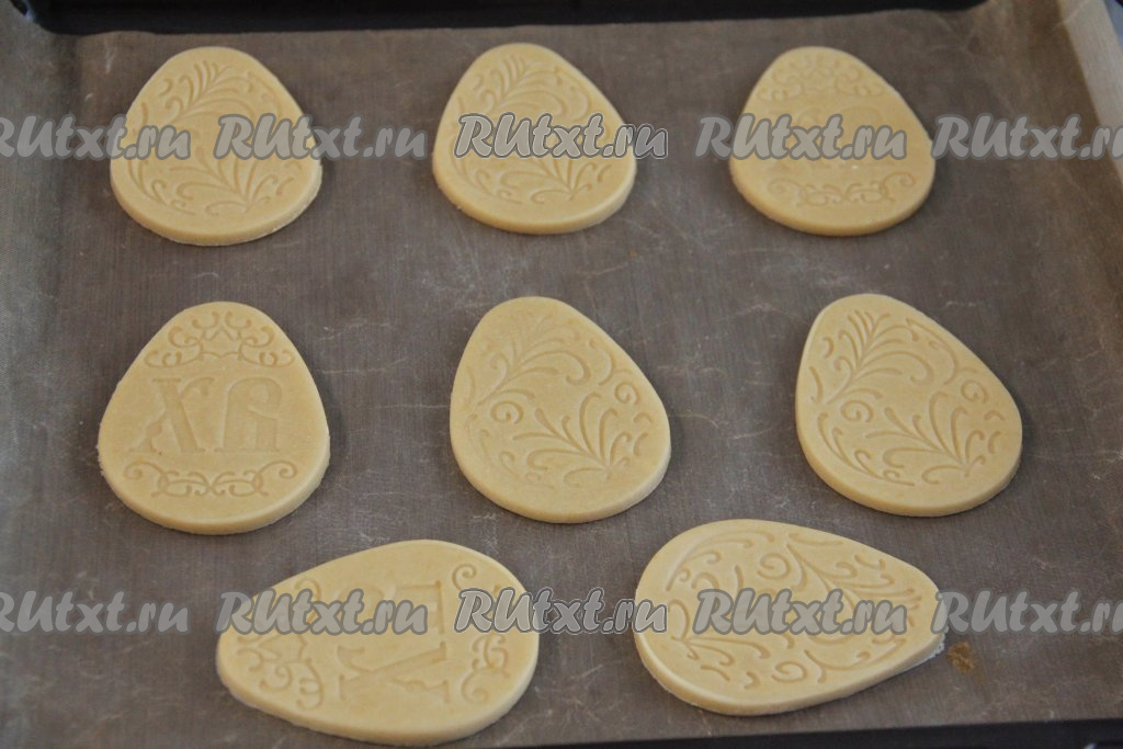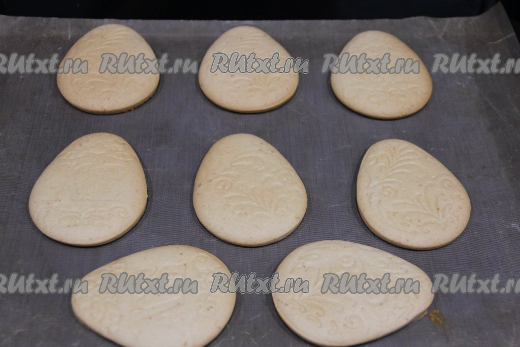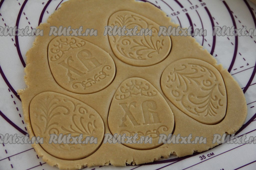 Готовое тесто разделить на несколько частей. Каждую часть теста на присыпанной мукой поверхности раскатать скалкой в пласт толщиной примерно 0,5 сантиметра. Вырезать пряники нужной формы (это можно сделать с помощью формочек для печенья, а если вы готовите тематические пряники, тогда можно взять покупной трафарет нужной формы или заранее вырезать нужный трафарет из бумаги, приложить к раскатанному тесту и вырезать ножом). Я готовила пасхальные пряники, формируя их в виде яиц с помощью покупной формы со штампом, которая выдавливает рисунок.