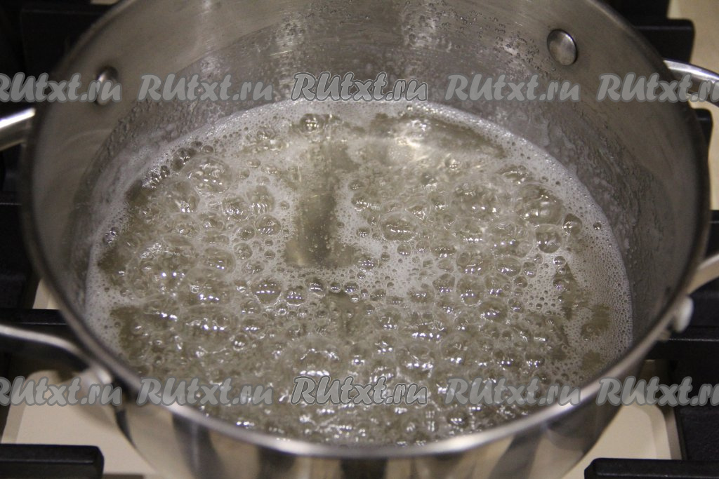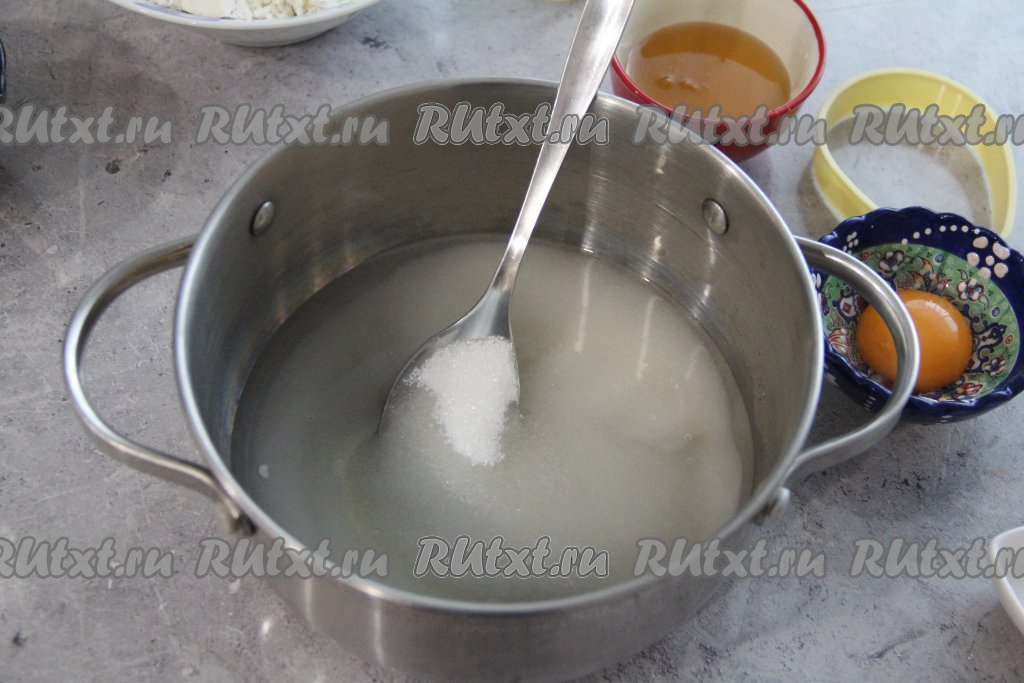 Взять глубокую кастрюлю (в процессе варки будет добавляться сода и масса сильно увеличится в объёме, поэтому и нужно сразу готовить в глубокой кастрюле). Влить в эту кастрюлю воду, всыпать сахар, перемешать и поставить на огонь.