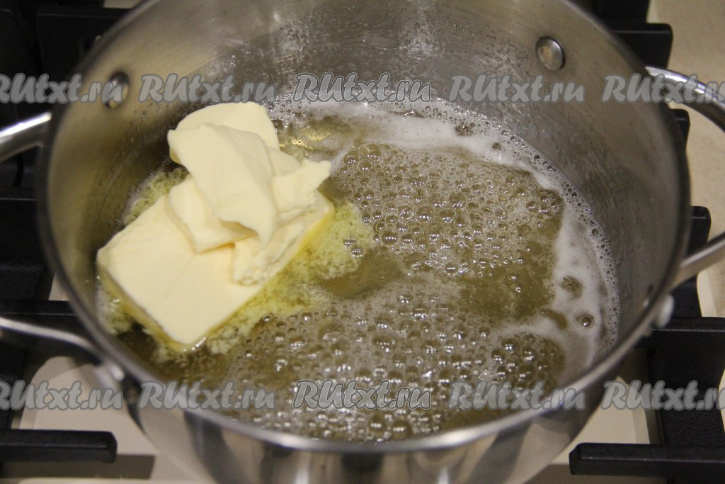 После этого добавить в кастрюлю мёд и масло, варить, перемешивая, до полного растворения масла с мёдом.