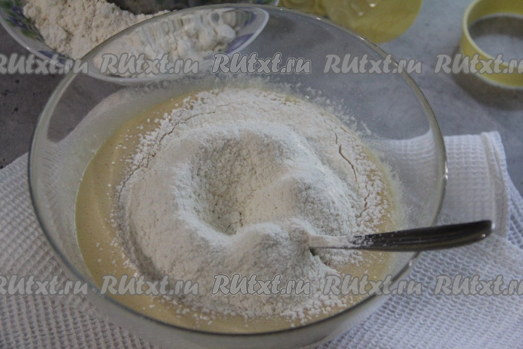 Всыпать частями просеянную муку, перемешивая пряничное тесто вначале ложкой, а затем продолжая выполнять замес руками.