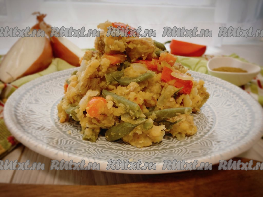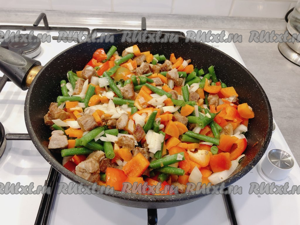 Затем в сковороду отправляем все оставшиеся овощи: болгарский перец, стручковую фасоль и лук. Хорошенько перемешиваем и тушим под крышкой на маленьком огне ещё минут 7, иногда перемешивая. За это время овощи дадут достаточно сока, но не успеют превратиться в пюре.