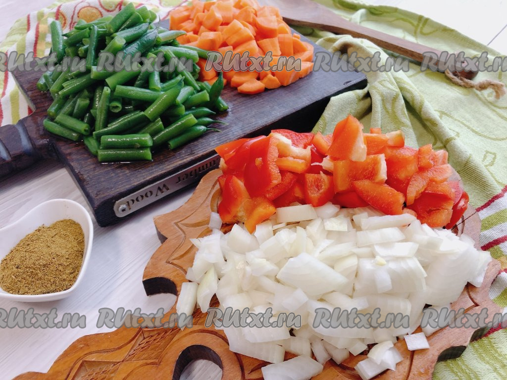 Пока обжаривается мясо, займёмся овощами. Лук и морковь очищаем от кожицы, болгарский перец - от семян и плодоножки. У стручковой фасоли отрезаем "кончики" с двух сторон. Все овощи промываем водой и нарезаем на небольшие кусочки.