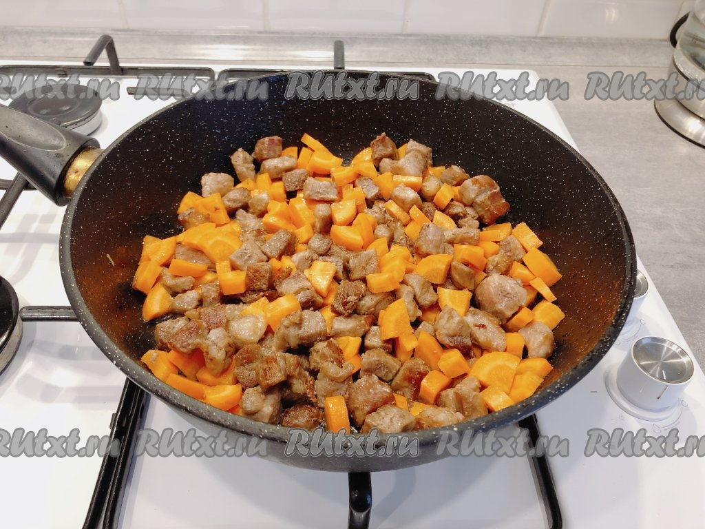 В сковороду к обжаренному мясу отправляем морковь, перемешиваем, накрываем крышкой и томим на маленьком огне минут 5, периодически перемешивая. Морковь я добавляю в первую очередь, потому что она самая жёсткая из всех используемых овощей и нужно чуть больше времени, чтобы довести её до готовности.