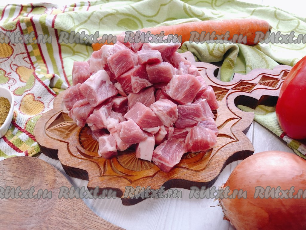 Мясо нарезаем на средние кусочки и обжариваем на растительном масле на среднем огне до появления румяной корочки со всех сторон (примерно 10-15 минут), солим и перчим по вкусу.