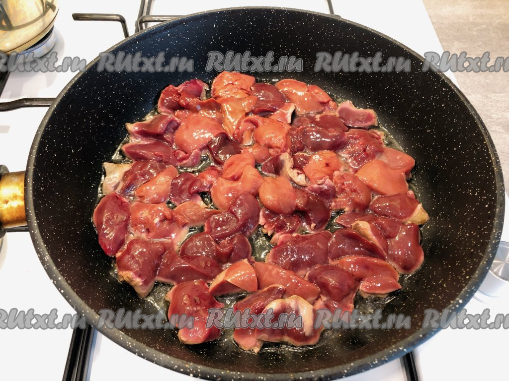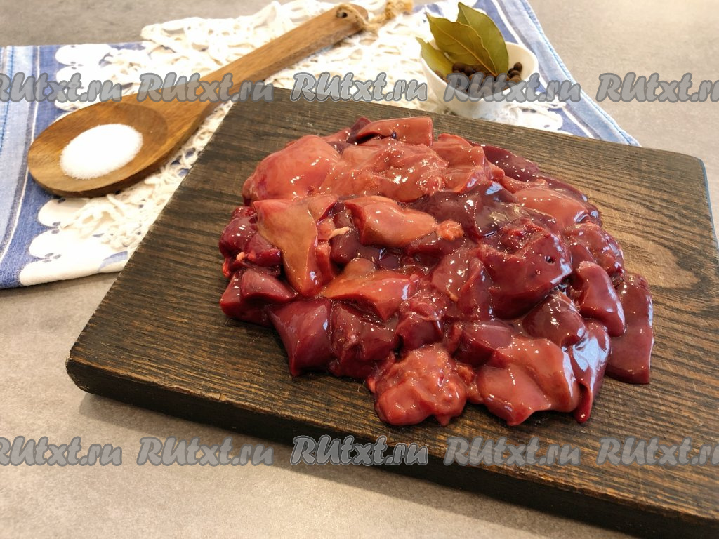 Пока отваривается картофель, займёмся куриной печенью (если используете замороженную печёнку, тогда она должна быть предварительно разморожена). Промываем печень под холодной водой, очищаем от плёнок и нарезаем на средние кусочки.