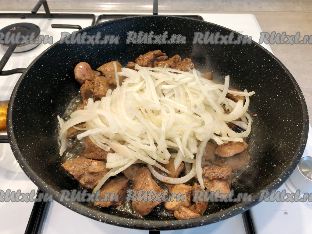 После того как печёнка обжарится в течение 7 минут (до готовности), добавляем к ней нарезанный лук. Обжариваем куриную печень с луком до прозрачности лука, периодически перемешивая (в течение 3-4 минут).