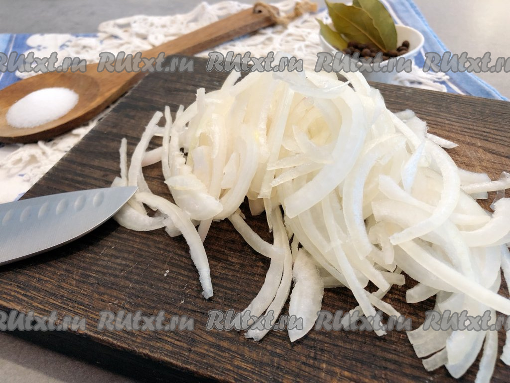 В это время очищаем, моем лук, а затем нарезаем его на достаточно тонкие полукольца.