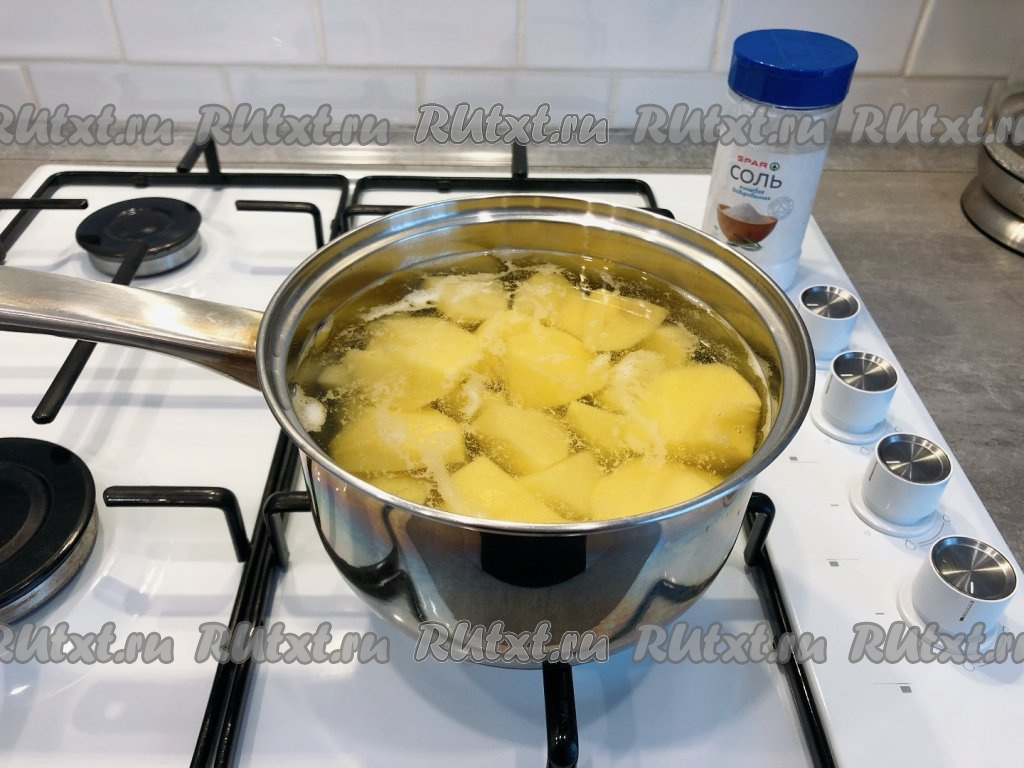 Перекладываем подготовленный картофель в кастрюлю, полностью заливаем холодной водой, ставим на огонь, а после закипания на небольшом огне отвариваем до полуготовности (в течение 10 минут). В процессе варки солим по вкусу. Затем воду сливаем, а картошку отставляем в сторону, она нам понадобится чуть позже.