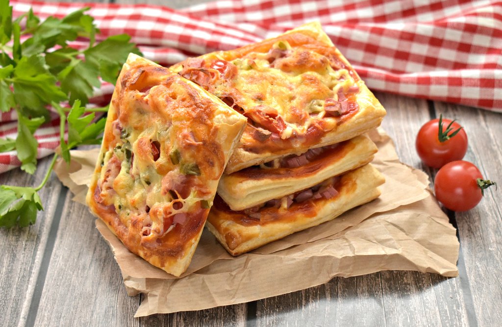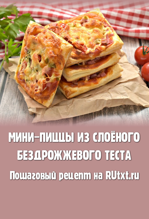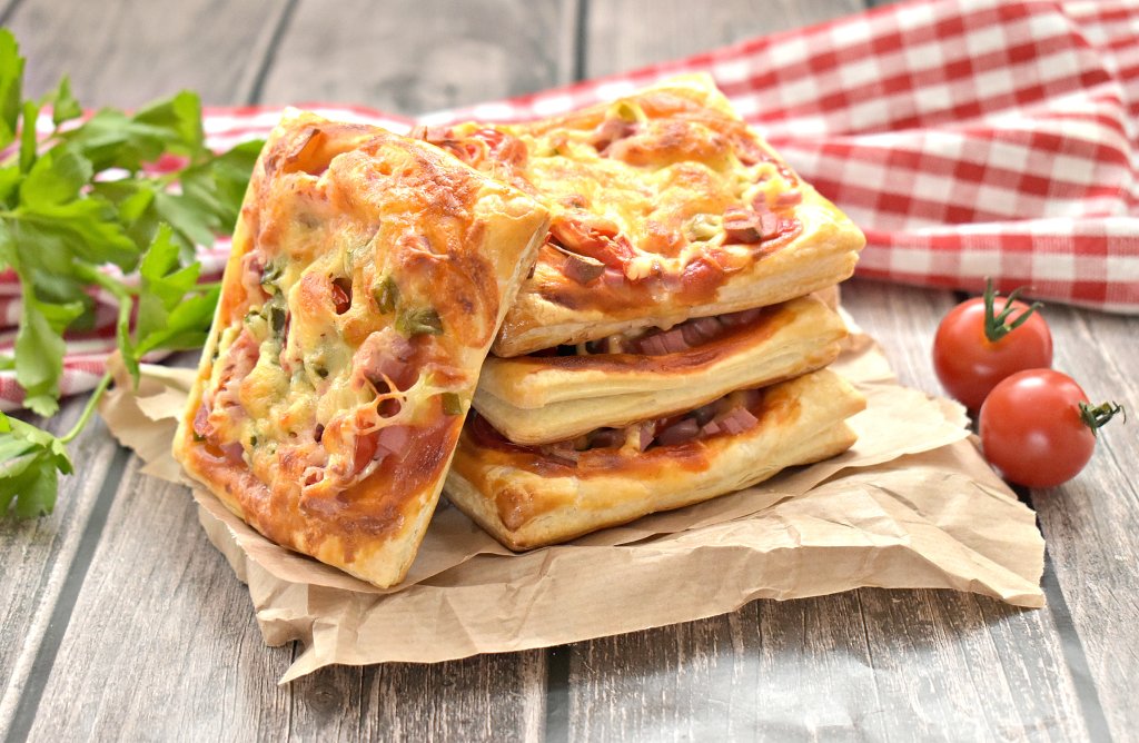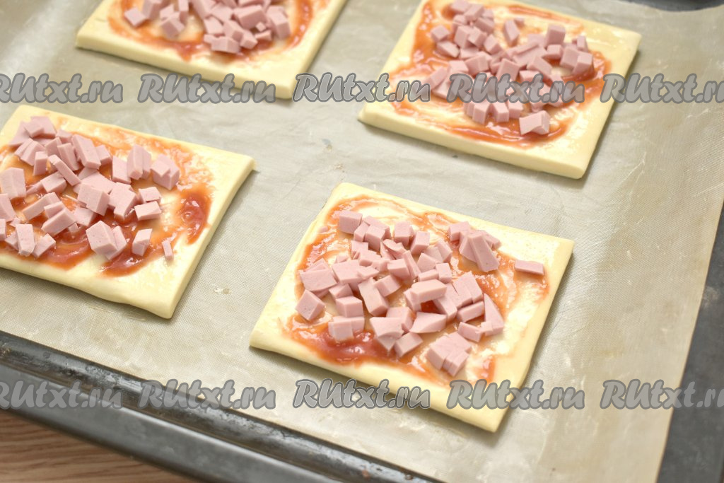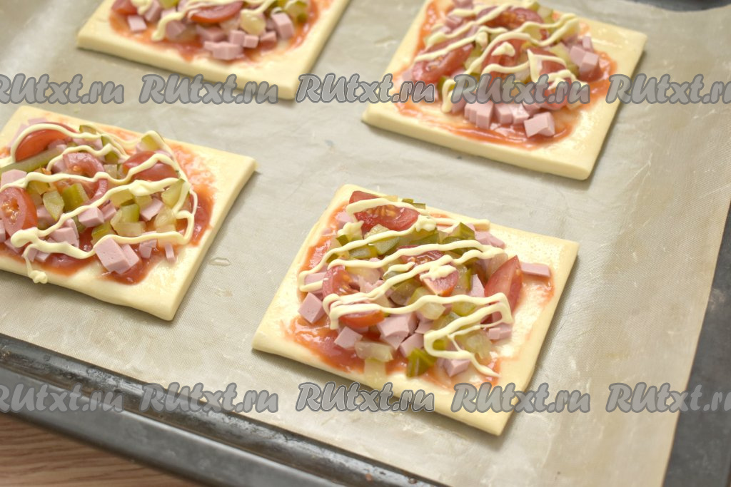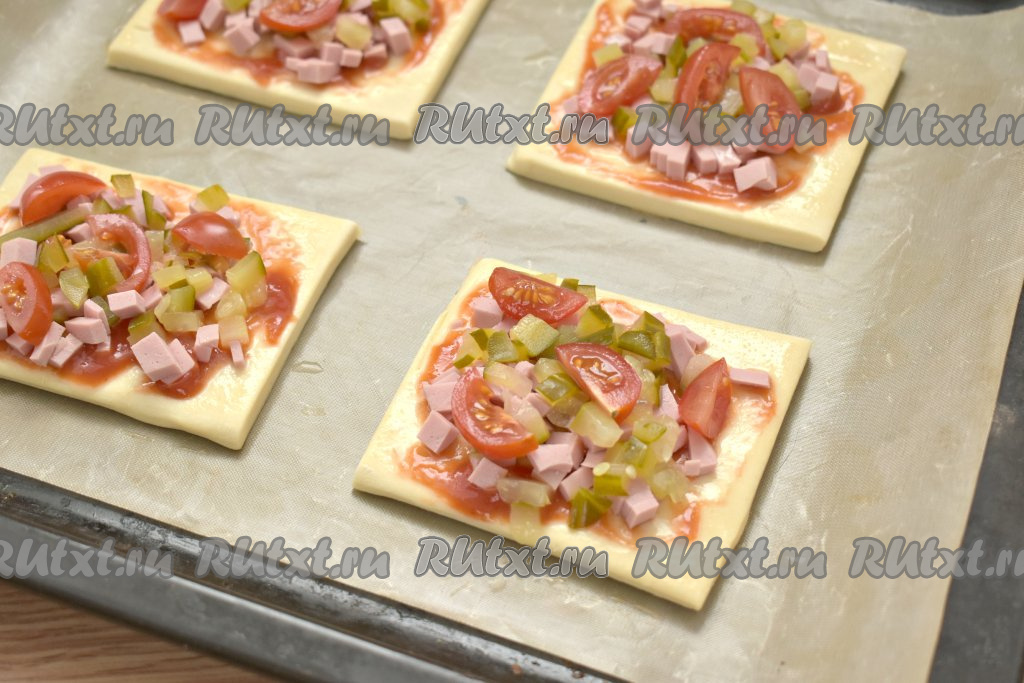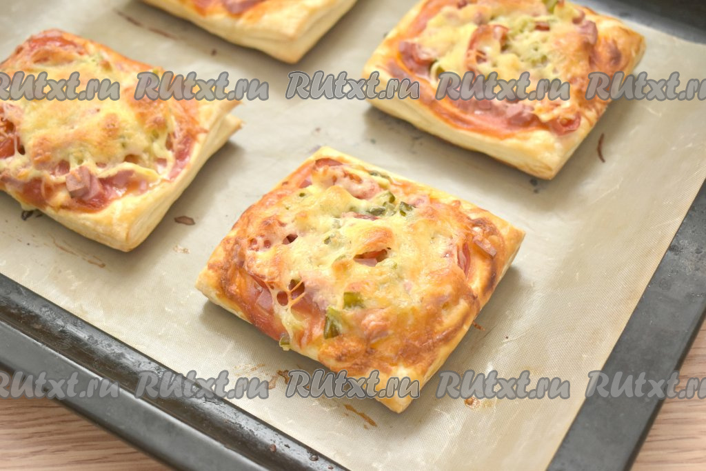 Домашние мини-пиццы, приготовленные из слоёного бездрожжевого теста, получились пышными, сочными и вкусными.