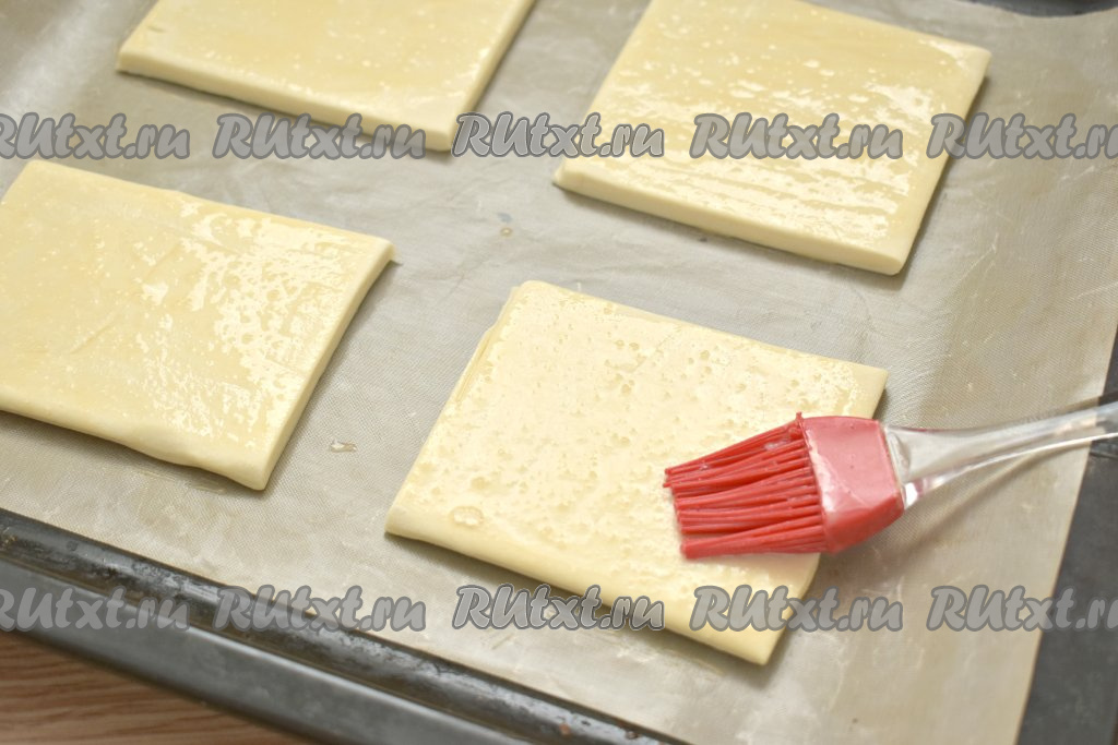 Заранее тесто достаём из морозилки, оставляем разморозиться при комнатной температуре. У меня слоёное тесто разморозилось через 1 час. Вначале первый пласт теста, не раскатывая, разрезаем на 4 квадрата и сразу перекладываем на противень, застеленный ковриком для выпечки (или пергаментом). Яйцо в небольшой ёмкости взбиваем вилкой. Смазываем квадраты из теста взбитым яйцом.