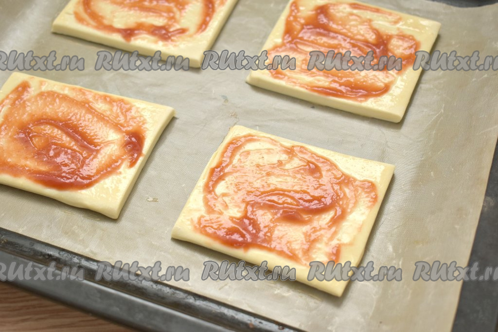 Сверху каждую заготовку смазываем примерно 0,5 столовой ложки томатного соуса.