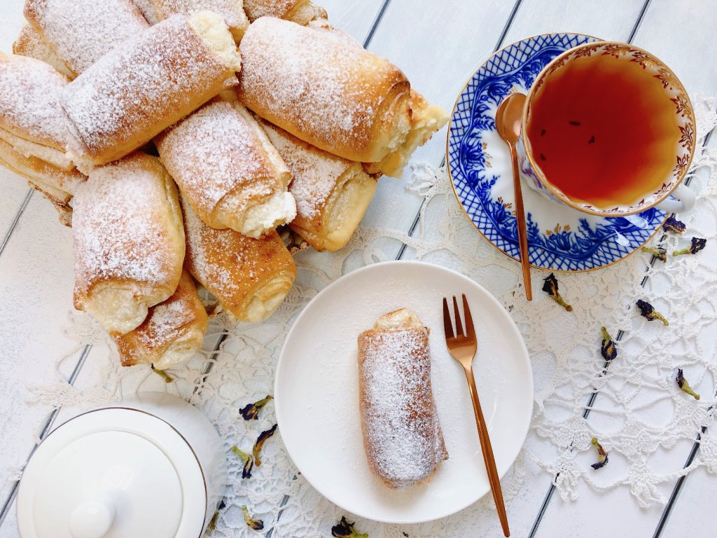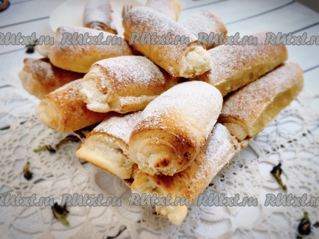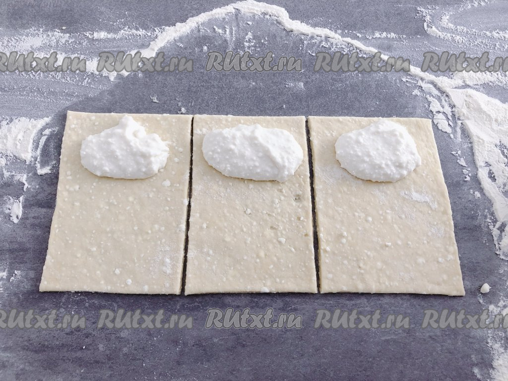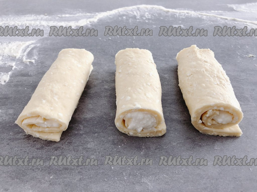 Рабочую поверхность присыпаем мукой, тесто делим на две части, чтобы с ним было удобно работать. Одну часть теста раскатываем скалкой в тонкий пласт, срезаем неровные края и нарезаем на прямоугольники размером 10 на 15 сантиметров. Работать с этим творожным тестом очень удобно. На каждый прямоугольник теста с узкой стороны, отступив немного от краёв, выкладываем примерно одну столовую ложку начинки и сворачиваем в рулетик, начиная со стороны с начинкой.