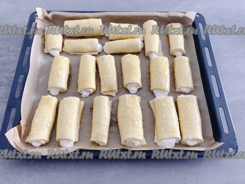 Обрезки теста не выбрасываем, а собираем в комок и, повторно раскатывая, формируем булочки. Всего у меня получилось 19 булочек-рулетиков. Сформированные творожные булочки перекладываем на противень, застеленный пергаментной бумагой (или смазанный растительным маслом). В небольшую ёмкость разбиваем яйцо, отделяем желток, добавляем в него 2 чайных ложки молока и перемешиваем до однородности. С помощью силиконовой кисточки смазываем поверхность булочек яично-молочной смесью.