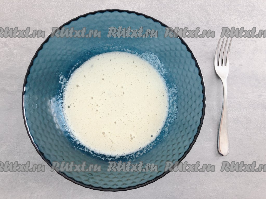 В яичную смесь кладём творог, вливаем молоко и хорошо перемешиваем, растирая вилкой кусочки творога.