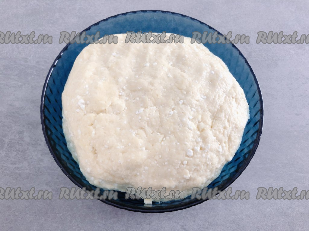 В получившуюся смесь просеиваем часть муки, смешанной с разрыхлителем, тщательно перемешиваем вилкой. Добавляем частями оставшуюся муку, каждый раз тщательно вмешивая её вилкой в творожное тесто. Тесто должно получиться густым, комковатым и тугим. Добавляем в него кусочки мягкого сливочного масла и далее вымешиваем тесто руками, собирая его в ком. Творог и молоко могут быть разной жирности, мука тоже бывает разной, поэтому если вдруг тесто не будет собираться в ком, влейте в него 1 столовую ложку молока.