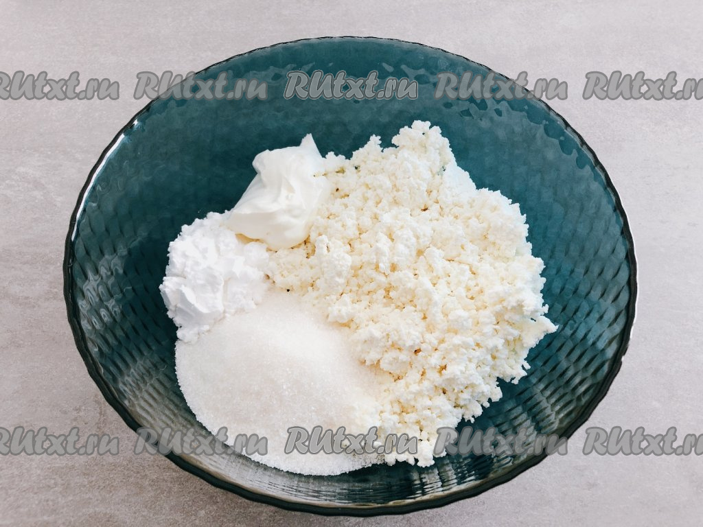 Пока творожное тесто "отдыхает", займёмся начинкой. Для этого в отдельной посуде смешиваем творог, сахар, сметану и 3 столовых ложки без горки крахмала. Перемешиваем начинку для булочек с помощью вилки до однородности и отставляем в сторону.