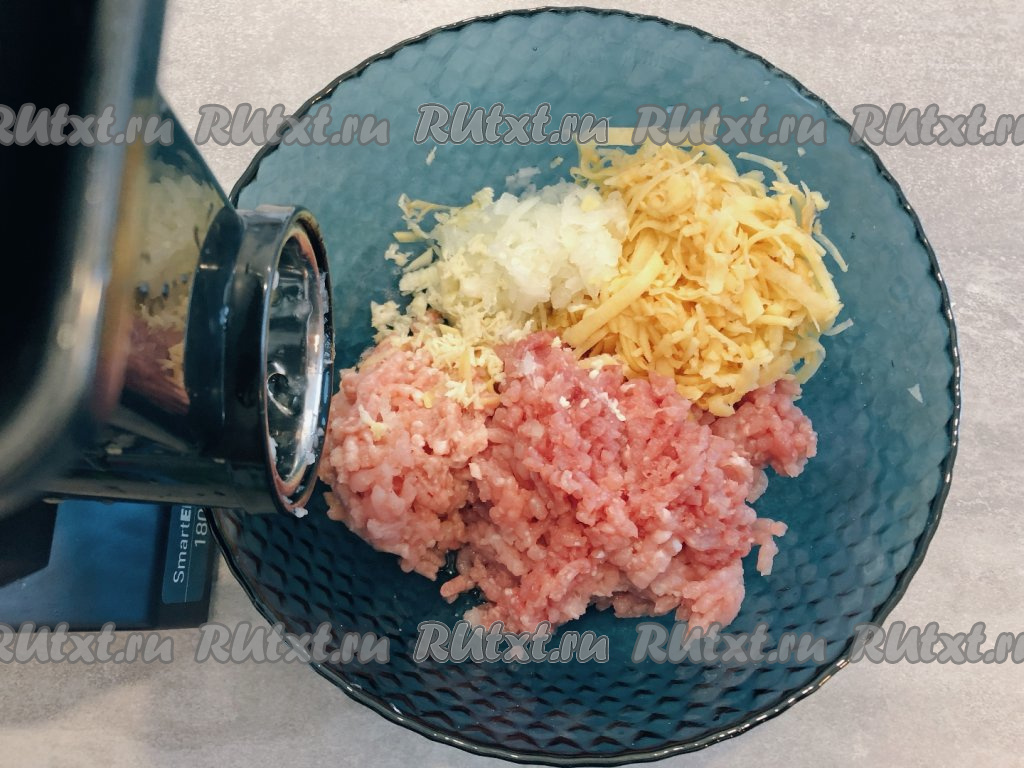 Моя электромясорубка работает ещё и как овощерезка, поэтому очищенный картофель, лук и чеснок я измельчила на ней. Если у вас обычная мясорубка, тогда очищенные лук и картофель можно просто перекрутить через мясорубку, а чеснок - натереть на мелкой тёрке. Измельчённые овощи добавить в миску с фаршем.