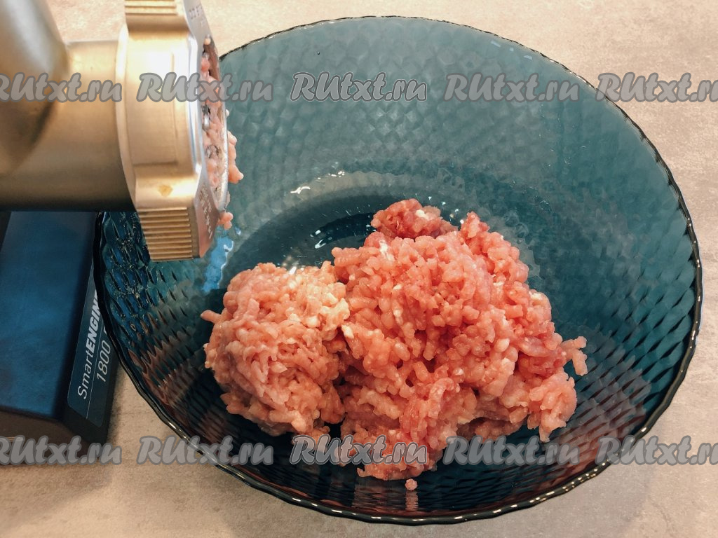 Мясо (в этот раз я взяла мякоть свинины и куриное мясо) промываем и обсушиваем. Если мясо заморожено, его нужно разморозить при комнатной температуре. Пропускаем мясо через мясорубку в глубокую миску.