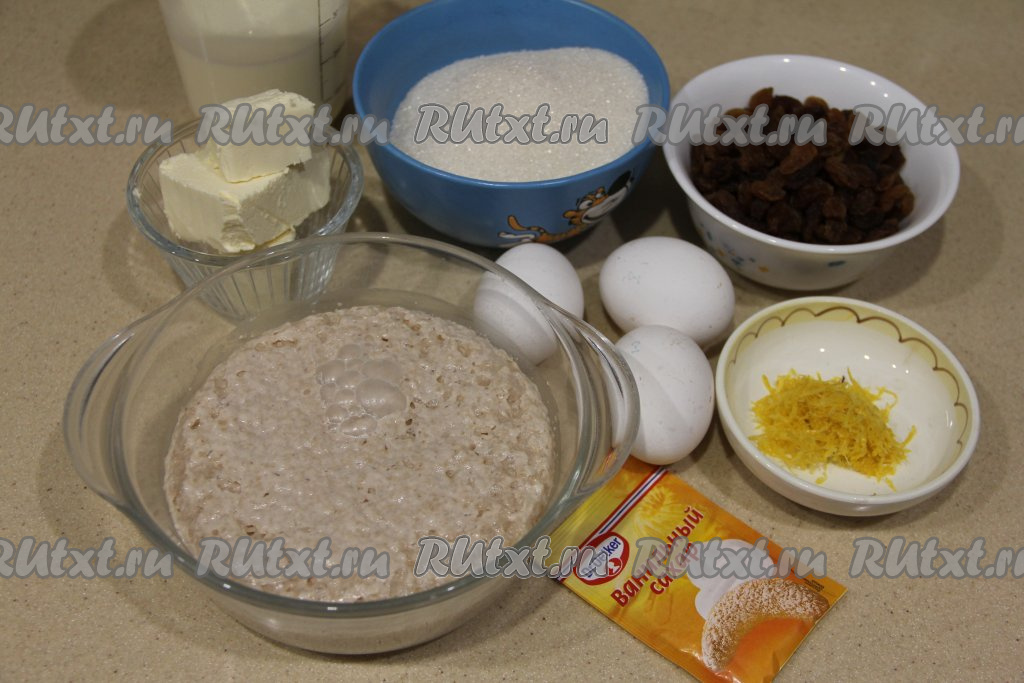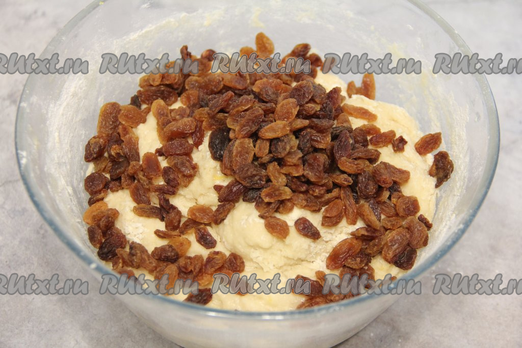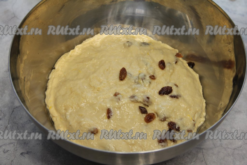 Вмесить изюм в тесто. Накрыть миску с тестом полотенцем и убрать в тепло на 1,5 часа.