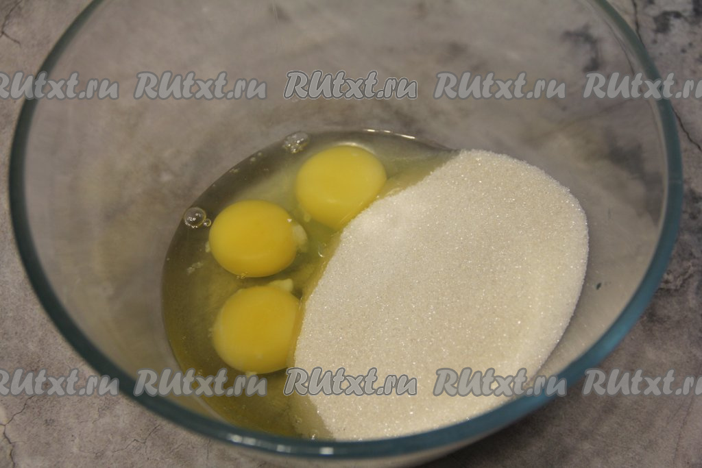 В глубокую миску вбить сырые яйца комнатной температуры и всыпать сахар.